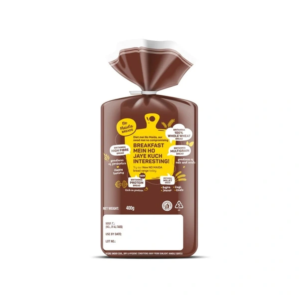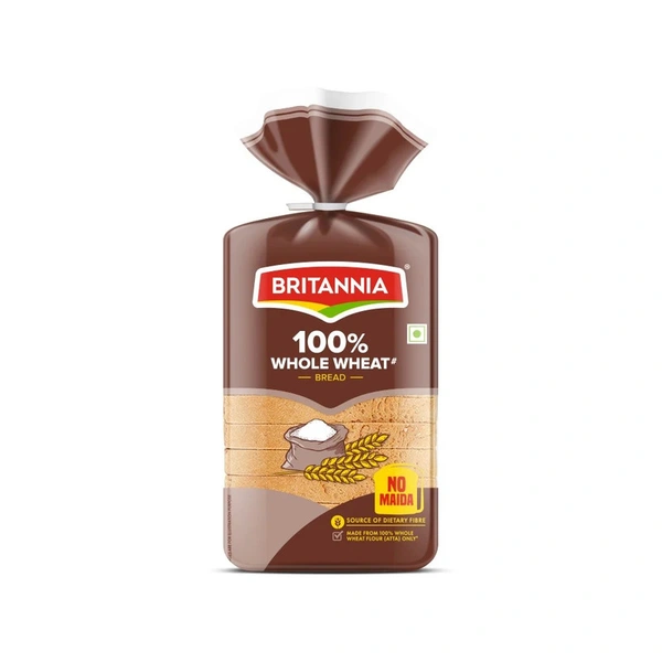 "Britannia 100% Whole Wheat Bread" is a nutritious, fiber-rich bread made from whole wheat flour, offering a healthy and wholesome option for sandwiches and toast.