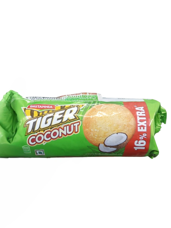 Britannia Tiger Krunch Coconut - 75.6 gm Crunchy coconut biscuits with a rich coconut taste, offering a delightful treat for snack lovers.