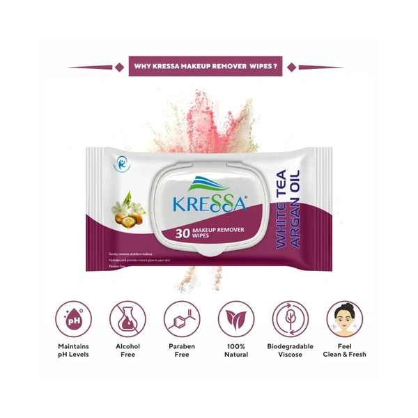 Kressa Makeup Remover Wipes: Gentle makeup remover wipes designed to effectively remove makeup without irritating the skin, leaving it fresh.