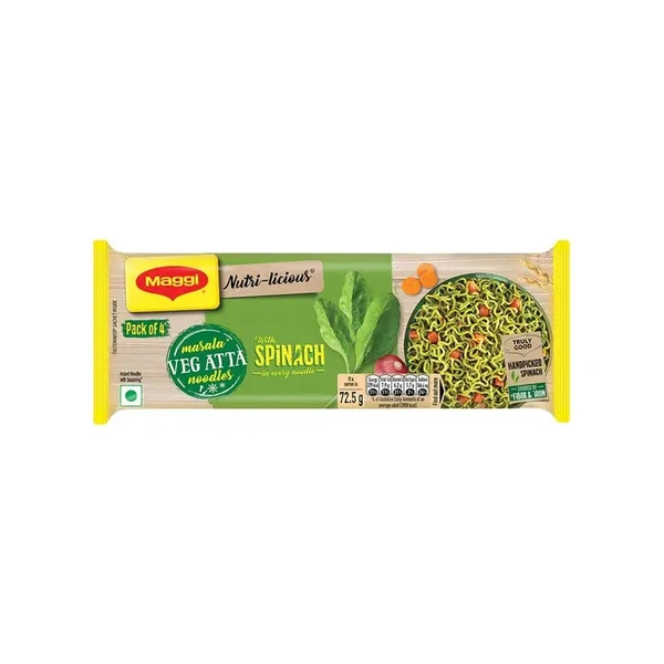 Maggi Nutri-Licious Masala Veg Atta Instant Noodles with Spinach: A nutritious variation of Maggi Nutri-Licious Noodles, enriched with spinach and whole wheat atta, offering a healthy and flavorful meal.